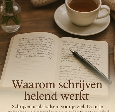 Daarom geloof ik dat schrijven een helende kracht heeft. Het helpt ons te luisteren naar wat diep vanbinnen leeft. Soms zijn dat zachte fluisteringen van verlangen, soms pijn die eindelijk gehoord wil worden. Alles mag er zijn.